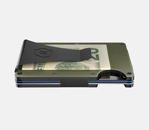 and holding a Matte Olive Titanium Ridge wallet